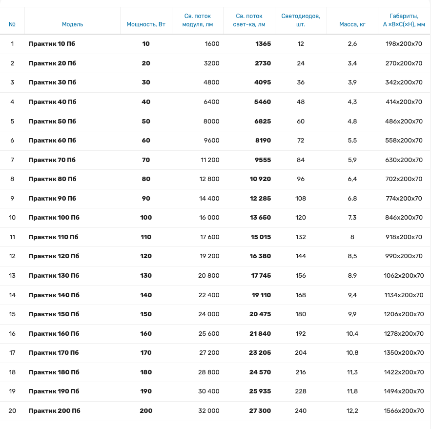 Потребляемая мощность 10–200 Вт Световой поток светильника 1 365–27 300 лм Напряжение питания сети 198-264/120-305 VAC Возможность низковольтного исполнения 12, 24, 36 VAC/VDC Частота питающей сети переменного тока 50–60 Гц Вид климатического исполнения У2 Индекс цветопередачи Ra 70-90 Цветовая температура 3000K / 4000K / 5000K / 6000K Пульсация светового потока < 1% Кривая сила света Д Угол раскрытия луча 120° Возможность изготовления с БАП 3 часа Возможность диммирования по протоколам DALI / Switch-Control (аналог 0-10V и 1-10V) Срок службы 60 000 часов Рабочая температура -40°С .. +40°C / -60°С .. +80°C / +5°С .. +40°C Степень защиты от воздействия ОС IP 65 / IP 67 Класс пожароопасной зоны П-I / П-II / П-IIа / П-III