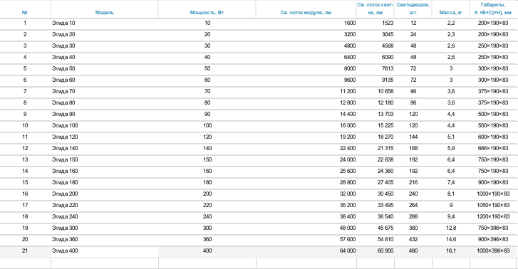 Потребляемая мощность 10–400 Вт Световой поток светильника 1 523–60 900 лм Напряжение питания сети 198-264/120-305 VAC Возможность низковольтного исполнения 12, 24, 36 VAC/VDC Частота питающей сети переменного тока 50–60 Гц Вид климатического исполнения У2 Индекс цветопередачи Ra 70-90 Цветовая температура 3000K / 4000K / 5000K / 6000K Пульсация светового потока < 1% Кривая сила света Д Кривая сила света с вторичной оптикой К / Г / Ш Угол раскрытия луча 120° Угол раскрытия луча с вторичной оптикой 10° / 25° / 60° / 90° / 155×65° Производитель светодиодов Lumileds Возможность изготовления с БАП 3 часа Возможность диммирования по протоколам DALI / Switch-Control (аналог 0-10V и 1-10V) Срок службы 60 000 / 100 000 часов Рабочая температура -40°С .. +40°C / -60°С .. +80°C / +5°С .. +40°C Степень защиты от воздействия ОС IP 65
