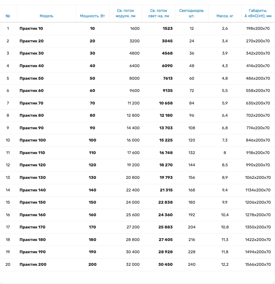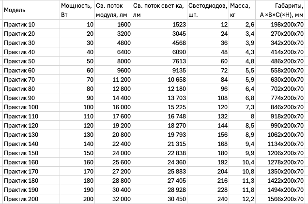 Световой поток светильника указанный в таблице модификаций доступен с индексом цветопередачи CRI70, цветовой температурой 5000К и прозрачным рассеивателем.