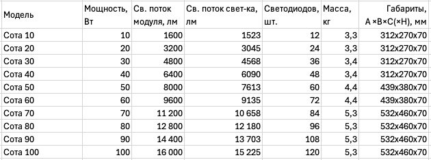 Световой поток светильника указанный в таблице модификаций доступен с индексом цветопередачи CRI70, цветовой температурой 5000К и прозрачным рассеивателем.