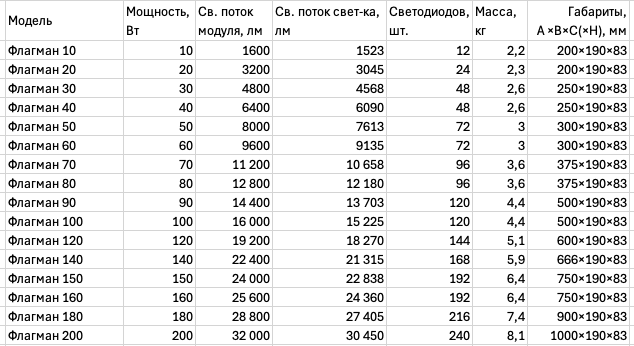 Световой поток светильника указанный в таблице модификаций доступен с индексом цветопередачи CRI70, цветовой температурой 5000К и прозрачным рассеивателем.