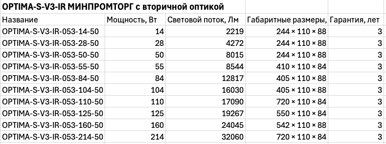 OPTIMA-S-V3-IR МИНПРОМТОРГ cо вторичной оптикой КСС – идеальное решение для уличного освещения! Светильник включен в Реестр Минпромторга (реестровые номера: 10193924-10193933). Светильники OPTIMA-S-V3-IR созданы для освещения федеральных трасс, дорог местного назначения, парковок, придомовых и промышленных территорий, а также парков и скверов. Обеспечьте безопасность и комфорт на ваших улицах!