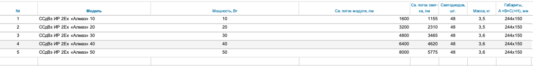 Потребляемая мощность 10–50 Вт Световой поток светильника 1 155–5 775 лм Напряжение питания сети 198-264/120-305 VAC Возможность низковольтного исполнения 12, 24, 36 VAC/VDC Частота питающей сети переменного тока 50–60 Гц Вид климатического исполнения УХЛ1 Индекс цветопередачи Ra 70-90 Цветовая температура 4000K / 5000K / 6000K Пульсация светового потока < 1% Кривая сила света Д Кривая сила света с вторичной оптикой К / Г / Ш Угол раскрытия луча 120° Угол раскрытия луча с вторичной оптикой 10° / 25° / 60° / 90° / 155×65° Возможность изготовления с БАП 3 часа Срок службы 60 000 / 100 000 часов Рабочая температура -40°С .. +40°C / -60°С .. +80°C / +5°С .. +40°C Степень защиты от воздействия ОС IP 65 / IP 67 Маркировка взрывозащиты 2Ex na IIC T5...T3 Gc X, Ex tb IIIC T100°C...T195°C Db X
