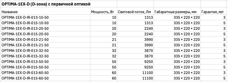 Особенности: Взрывозащищённые светодиодные светильники OPTIMA-1EX-D-IR с увеличенным световым потоком до 190 Лм/Вт в литом корпусе и обеспечиваемой взрывозащитой по пыли и газу 1Ex d IIB T6 Gb X / Ex tb IIIC T85°C Db X. Область применения: взрывоопасные газовые зоны классов 1 и 2 (классы по ГОСТ IEC 60079-10-1-2011), категорий IIA, IIB, IIC (подгруппы по ГОСТ Р МЭК 60079-20-1-2011) и температурным классам Т1, Т2, Т3, Т4, Т5 и Т6 (по ГОСТ Р МЭК 60079-20-1-2011), а также зоны опасные по воспламенению горючей пыли классов 21 и 22, категорий IIIA, IIIB, IIIC (по ГОСТ IEC 60079-10-2-2011) в соответствии с присвоенной маркировкой взрывозащиты. По запросу комплектация защитной решеткой.